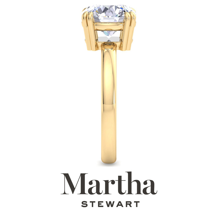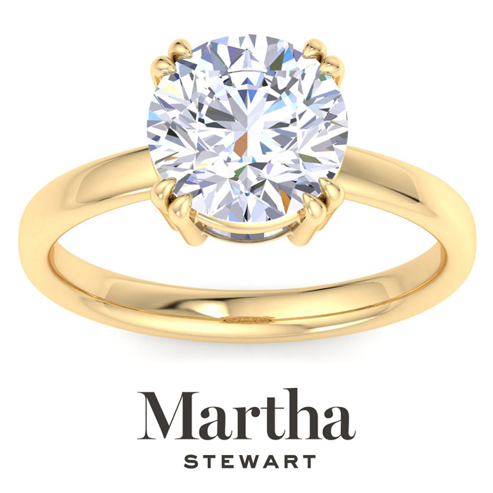 Showcasing class, style and timeless sophistication, the Martha Stewart fine jewelry collection is here to be celebrated. This Martha Stewart lab grown diamond ring features a 3 carat round shape center lab grown diamond in G-H color, VS clarity. This ring is in 14 karat yellow gold. This Martha Stewart ring has a double prong setting and is comfort fit for a luxurious feel on your finger. This ring also has a patent pending mirrored setting which increases the primary diamond's brilliance and beauty. Whether for a special occasion or to add a touch of elegance to everyday wear, this ring is sure to become a beloved heirloom. Martha Stewart’s dedication to quality and attention to detail are reflected in every piece, making this collection a celebration of timeless beauty and exceptional craftsmanship.