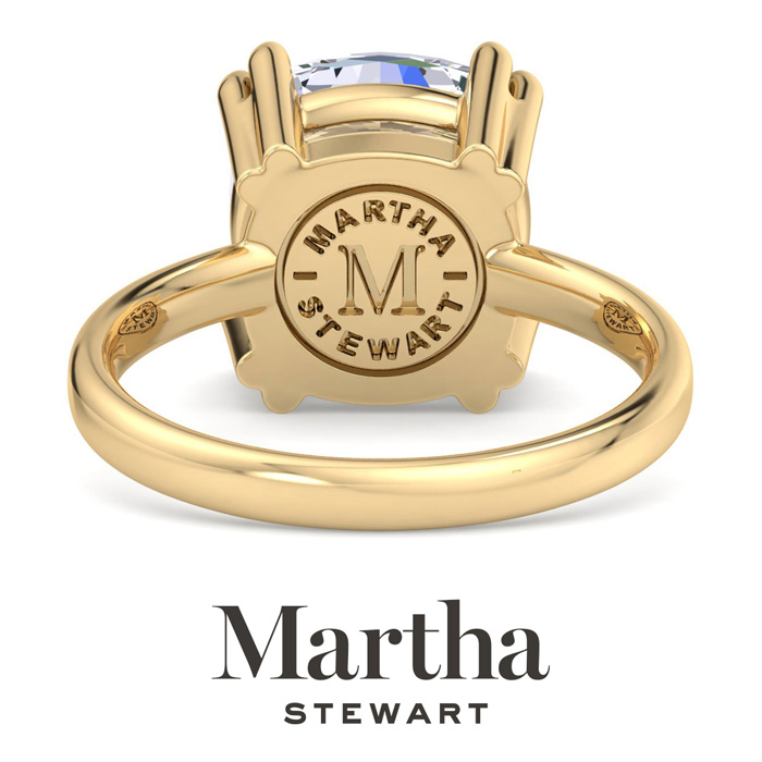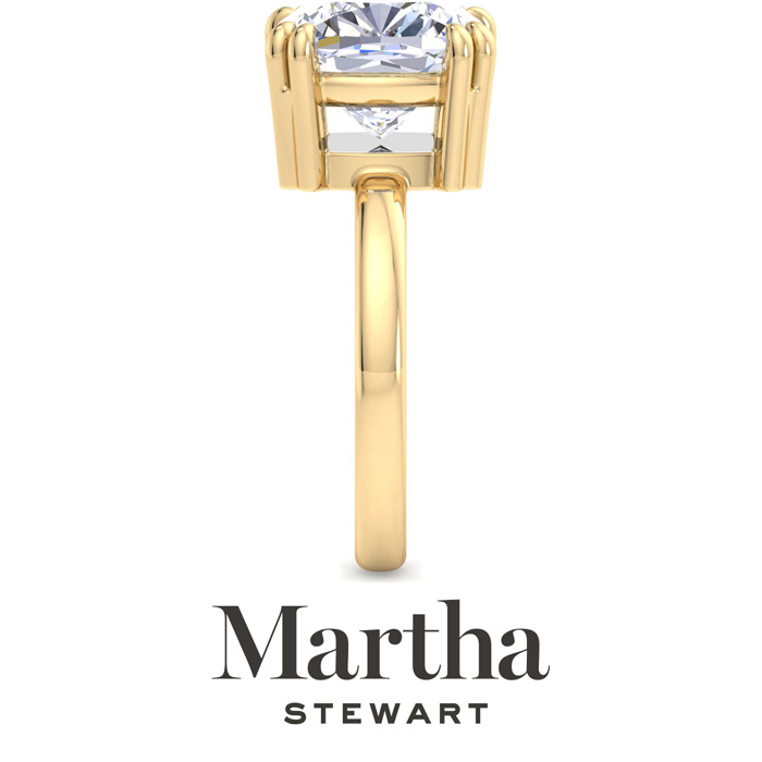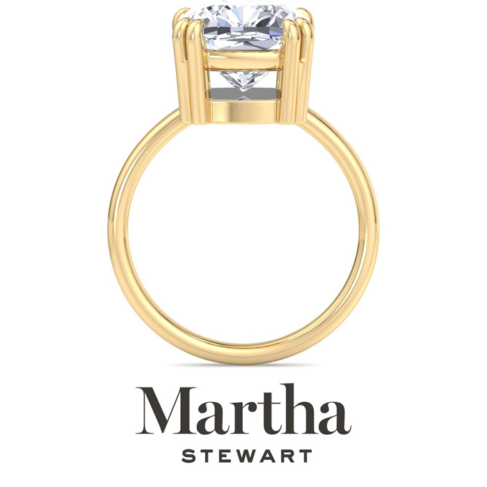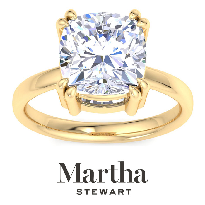 Showcasing class, style and timeless sophistication, the Martha Stewart fine jewelry collection is here to be celebrated. This Martha Stewart lab grown diamond ring features a 5 carat cushion cut center lab grown diamond in G-H color, VS clarity. This ring is in 14 karat yellow gold. This Martha Stewart ring has a double prong setting and is comfort fit for a luxurious feel on your finger. This ring also has a patent pending mirrored setting which increases the primary diamond's brilliance and beauty. Whether for a special occasion or to add a touch of elegance to everyday wear, this ring is sure to become a beloved heirloom. Martha Stewart’s dedication to quality and attention to detail are reflected in every piece, making this collection a celebration of timeless beauty and exceptional craftsmanship.