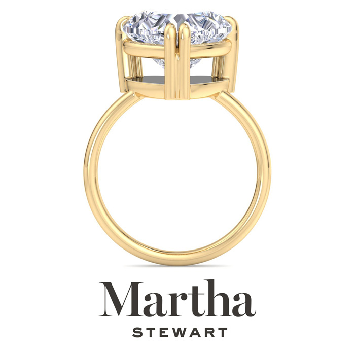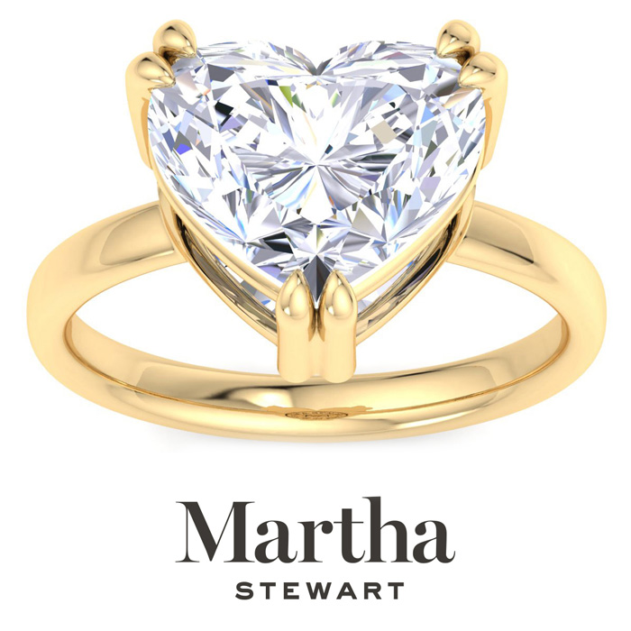 Showcasing class, style and timeless sophistication, the Martha Stewart fine jewelry collection is here to be celebrated. This Martha Stewart lab grown diamond ring features a 5 carat heart shape center lab grown diamond in G-H color, VS clarity. This ring is in 14 karat yellow gold. This Martha Stewart ring has a double prong setting and is comfort fit for a luxurious feel on your finger. This ring also has a patent pending mirrored setting which increases the primary diamond's brilliance and beauty. Whether for a special occasion or to add a touch of elegance to everyday wear, this ring is sure to become a beloved heirloom. Martha Stewart’s dedication to quality and attention to detail are reflected in every piece, making this collection a celebration of timeless beauty and exceptional craftsmanship.