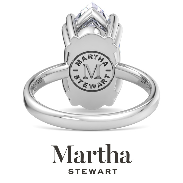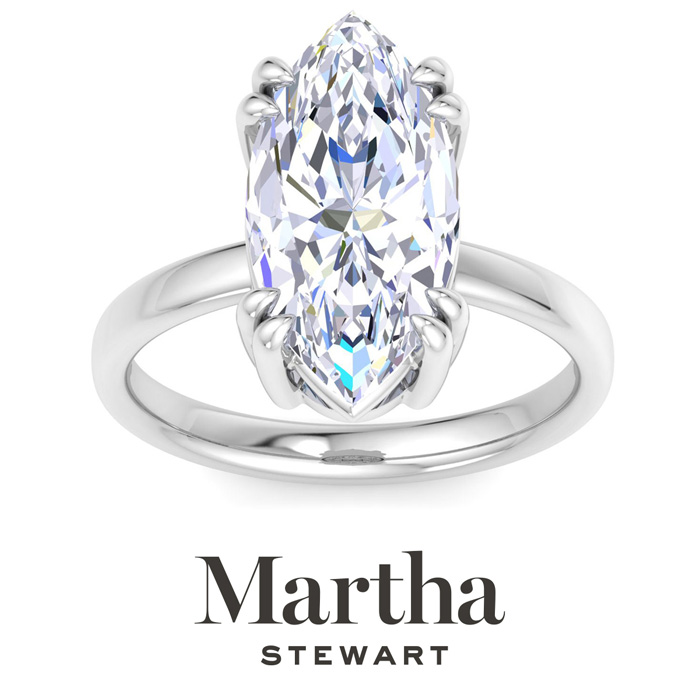 Showcasing class, style and timeless sophistication, the Martha Stewart fine jewelry collection is here to be celebrated. This Martha Stewart lab grown diamond ring features a 5 carat marquise shape center lab grown diamond in G-H color, VS clarity. This ring is in 14 karat white gold. This Martha Stewart ring has a double prong setting and is comfort fit for a luxurious feel on your finger. This ring also has a patent pending mirrored setting which increases the primary diamond's brilliance and beauty. Whether for a special occasion or to add a touch of elegance to everyday wear, this ring is sure to become a beloved heirloom. Martha Stewart’s dedication to quality and attention to detail are reflected in every piece, making this collection a celebration of timeless beauty and exceptional craftsmanship.