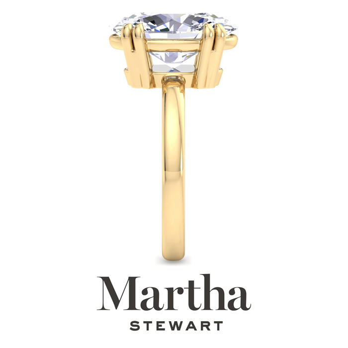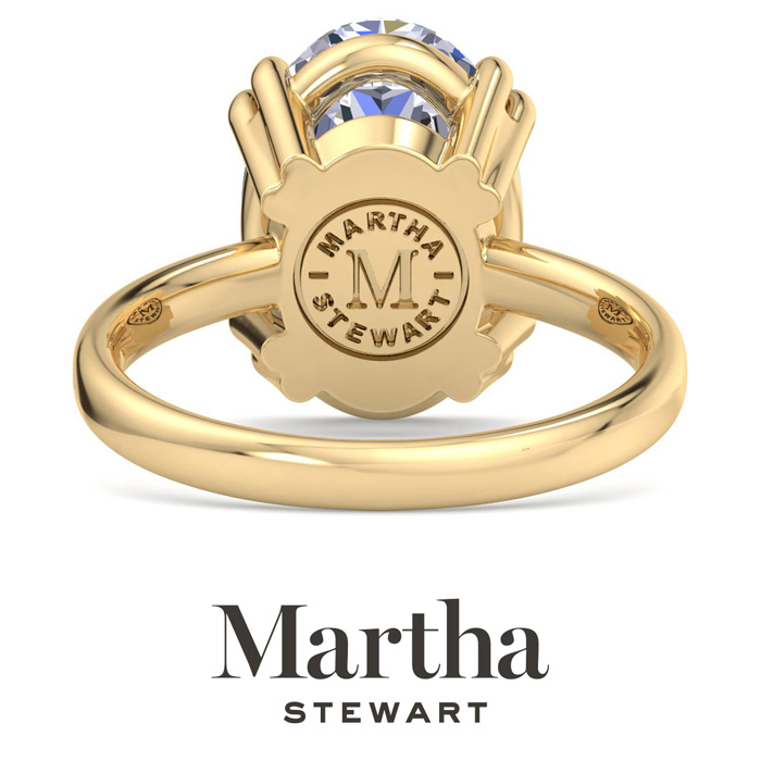 Showcasing class, style and timeless sophistication, the Martha Stewart fine jewelry collection is here to be celebrated. This Martha Stewart lab grown diamond ring features a 5 carat oval shape center lab grown diamond in G-H color, VS clarity. This ring is in 14 karat yellow gold. This Martha Stewart ring has a double prong setting and is comfort fit for a luxurious feel on your finger. This ring also has a patent pending mirrored setting which increases the primary diamond's brilliance and beauty. Whether for a special occasion or to add a touch of elegance to everyday wear, this ring is sure to become a beloved heirloom. Martha Stewart’s dedication to quality and attention to detail are reflected in every piece, making this collection a celebration of timeless beauty and exceptional craftsmanship.