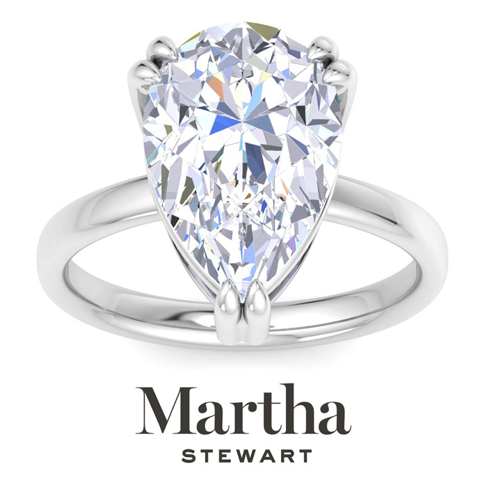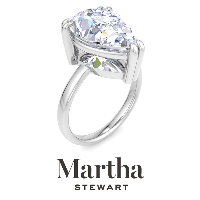 Showcasing class, style and timeless sophistication, the Martha Stewart fine jewelry collection is here to be celebrated. This Martha Stewart lab grown diamond ring features a 5 carat pear shape center lab grown diamond in G-H color, VS clarity. This ring is in 14 karat white gold. This Martha Stewart ring has a double prong setting and is comfort fit for a luxurious feel on your finger. This ring also has a patent pending mirrored setting which increases the primary diamond's brilliance and beauty. Whether for a special occasion or to add a touch of elegance to everyday wear, this ring is sure to become a beloved heirloom. Martha Stewart’s dedication to quality and attention to detail are reflected in every piece, making this collection a celebration of timeless beauty and exceptional craftsmanship.