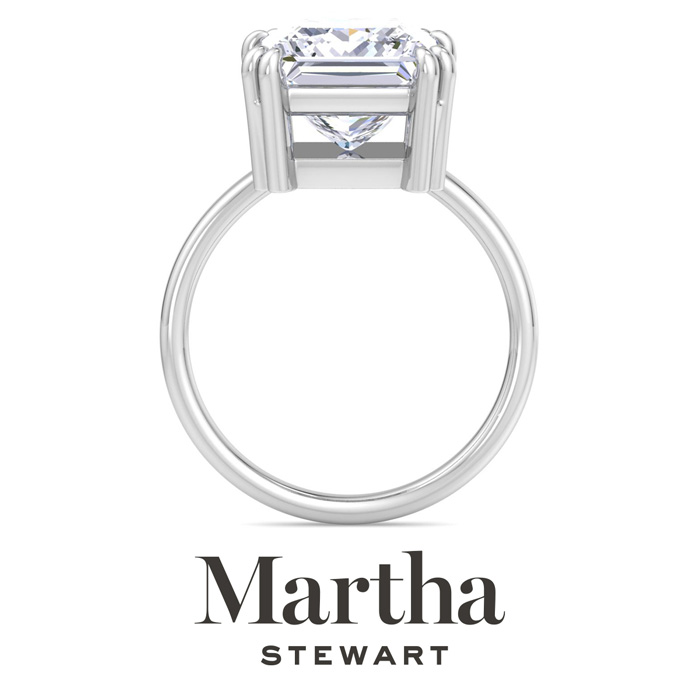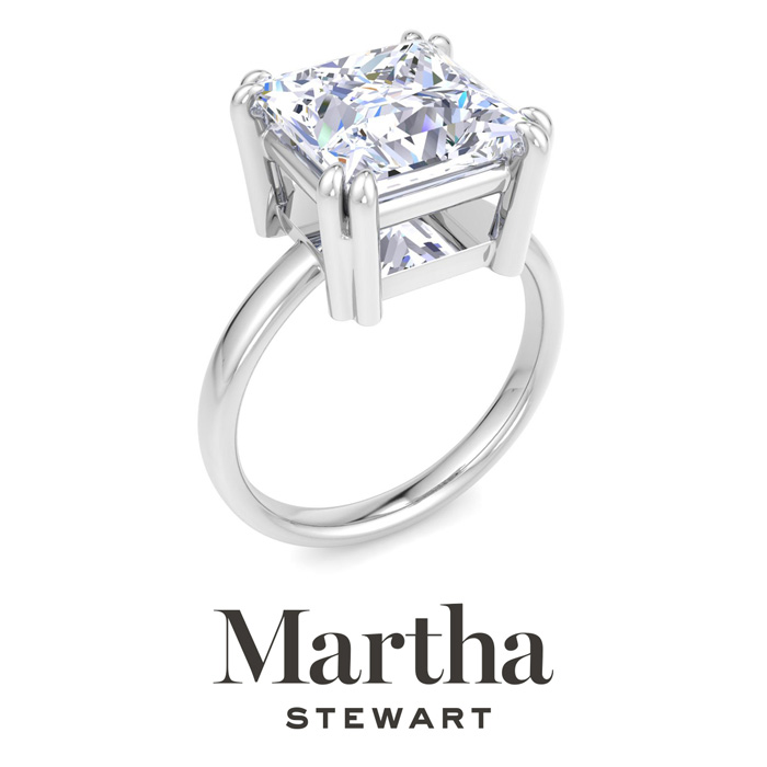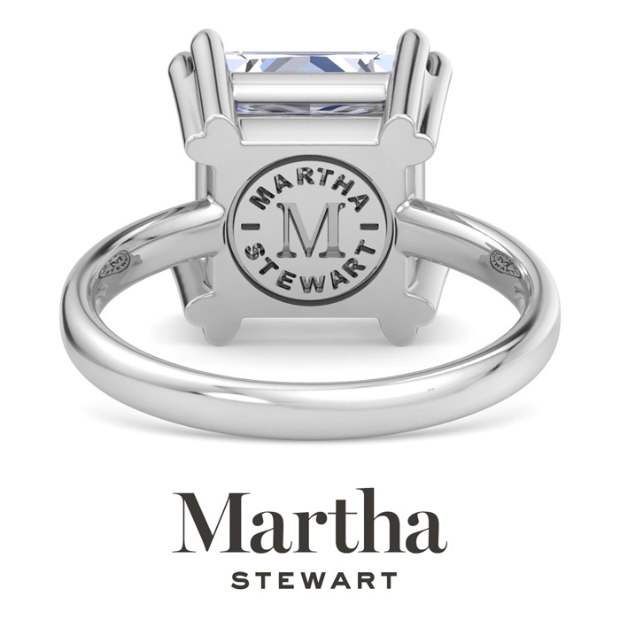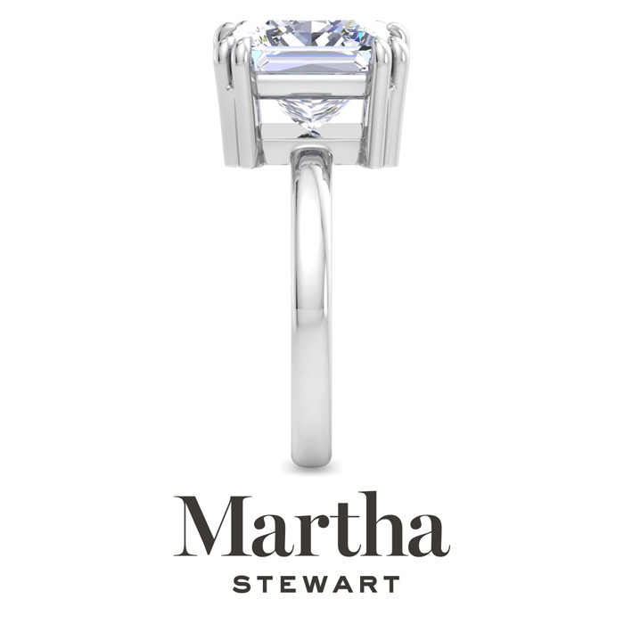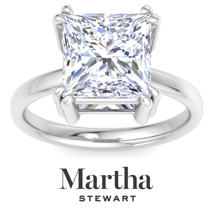 Showcasing class, style and timeless sophistication, the Martha Stewart fine jewelry collection is here to be celebrated. This Martha Stewart lab grown diamond ring features a 5 carat princess cut center lab grown diamond in G-H color, VS clarity. This ring is in 14 karat white gold. This Martha Stewart ring has a double prong setting and is comfort fit for a luxurious feel on your finger. This ring also has a patent pending mirrored setting which increases the primary diamond's brilliance and beauty. Whether for a special occasion or to add a touch of elegance to everyday wear, this ring is sure to become a beloved heirloom. Martha Stewart’s dedication to quality and attention to detail are reflected in every piece, making this collection a celebration of timeless beauty and exceptional craftsmanship.
