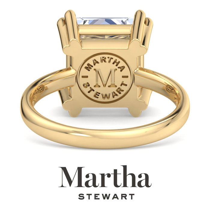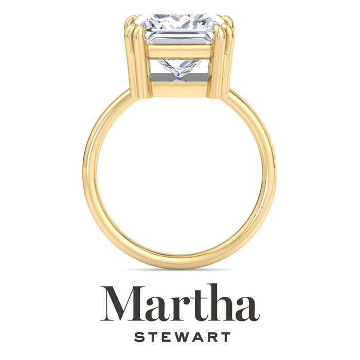 Showcasing class, style and timeless sophistication, the Martha Stewart fine jewelry collection is here to be celebrated. This Martha Stewart lab grown diamond ring features a 5 carat princess cut center lab grown diamond in G-H color, VS clarity. This ring is in 14 karat yellow gold. This Martha Stewart ring has a double prong setting and is comfort fit for a luxurious feel on your finger. This ring also has a patent pending mirrored setting which increases the primary diamond's brilliance and beauty. Whether for a special occasion or to add a touch of elegance to everyday wear, this ring is sure to become a beloved heirloom. Martha Stewart’s dedication to quality and attention to detail are reflected in every piece, making this collection a celebration of timeless beauty and exceptional craftsmanship.