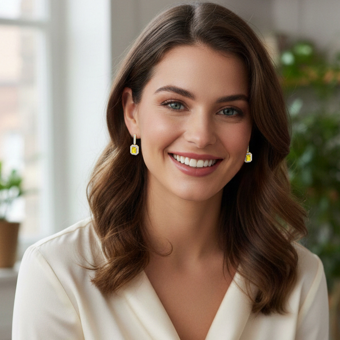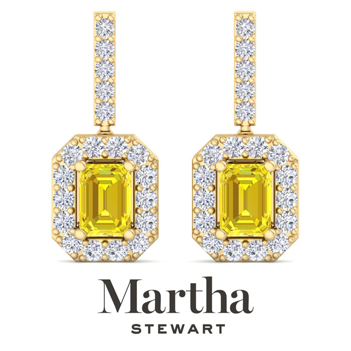 Showcasing class, style and timeless sophistication, the Martha Stewart fine jewelry collection is here to be celebrated. These Martha Stewart lab grown diamond earrings feature 38 round shape lab grown diamonds in G-H color, VS clarity and two 2 carat emerald cut fancy yellow lab grown diamonds. Total carat weight is 6 carats. These earrings are in 14 karat yellow gold and have post with screw backs. These earrings dangle down 1 inch! Whether worn for a special event or to enhance everyday elegance, these earrings are sure to become cherished heirlooms. Martha Stewart’s attention to detail and dedication to quality shine through in every piece, making this collection a celebration of refined craftsmanship and timeless beauty.