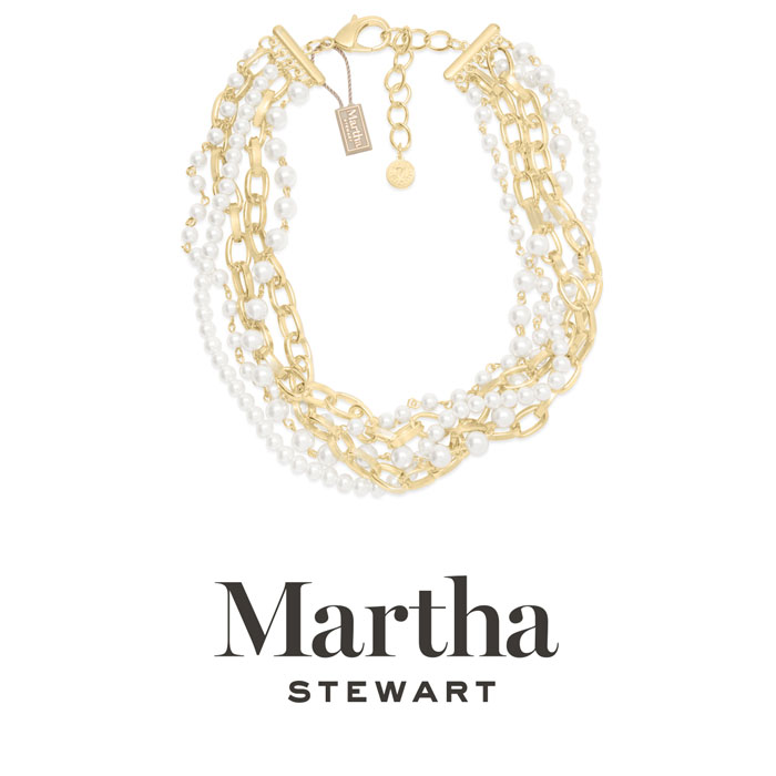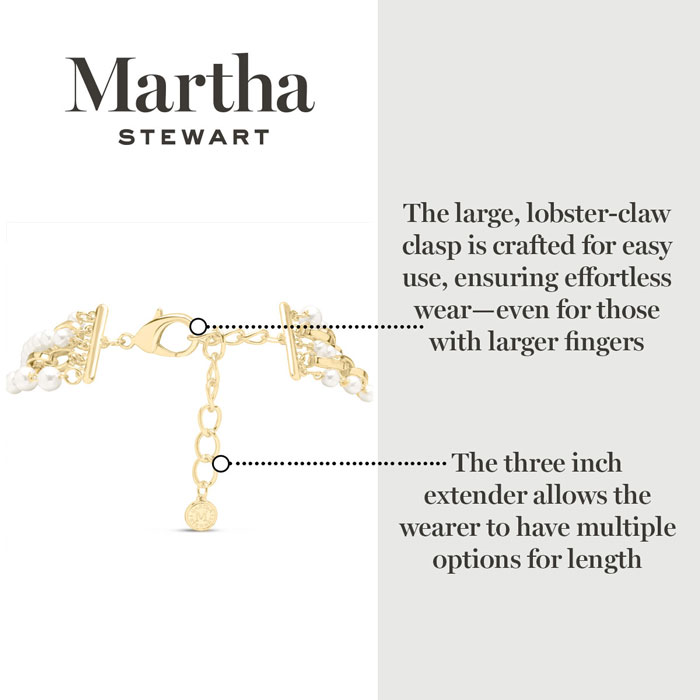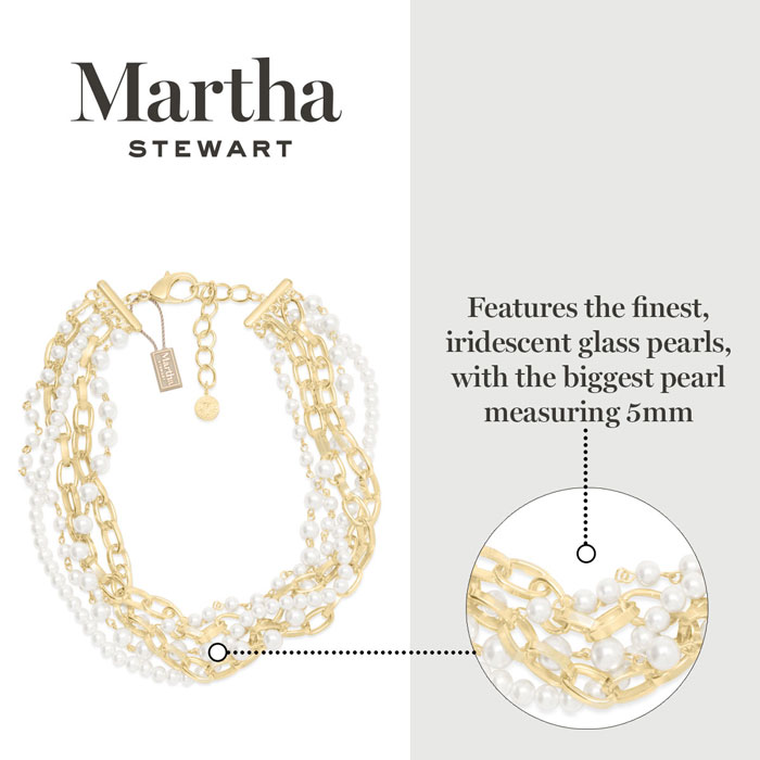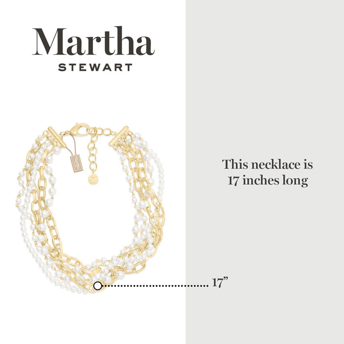 Exuding class, style, and timeless elegance, the Martha Stewart fashion jewelry collection is a true celebration of sophistication. This exquisite collection highlights distinctive chains, iridescent glass pearls, and dazzling crystals, all crafted with yellow gold-plated metal. Each piece reflects Martha Stewart's signature flair, offering a blend of uniqueness and refined style. This Martha Stewart necklace features strands of iridescent glass pearls and chain with the biggest iridescent glass pearl measuring 7mm. The chain length is 17 inches. This necklace is in yellow gold-plated brass metal and has a lobster claw clasp with a three inch extender.