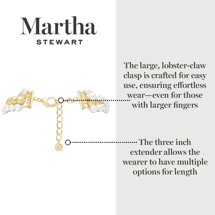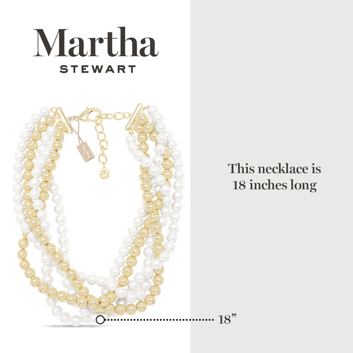 Exuding class, style, and timeless elegance, the Martha Stewart fashion jewelry collection is a true celebration of sophistication. This exquisite collection highlights distinctive chains, iridescent glass pearls, and dazzling crystals, all crafted with yellow gold-plated metal. Each piece reflects Martha Stewart's signature flair, offering a blend of uniqueness and refined style. This Martha Stewart necklace features strands of iridescent glass pearls and balls with each iridescent glass pearl measuring 10mm. The chain length is 18 inches. This necklace is in yellow gold-plated brass metal and has a lobster claw clasp with a three inch extender.