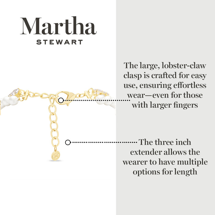 Exuding class, style, and timeless elegance, the Martha Stewart fashion jewelry collection is a true celebration of sophistication. This exquisite collection highlights distinctive chains, iridescent glass pearls, and dazzling crystals, all crafted with yellow gold-plated metal. Each piece reflects Martha Stewart's signature flair, offering a blend of uniqueness and refined style. This Martha Stewart necklace features strands of iridescent glass pearls and crystal with each iridescent glass pearl measuring 9mm. The chain length is 24 inches. This necklace is in yellow gold-plated brass metal and has a lobster claw clasp with a three inch extender.
