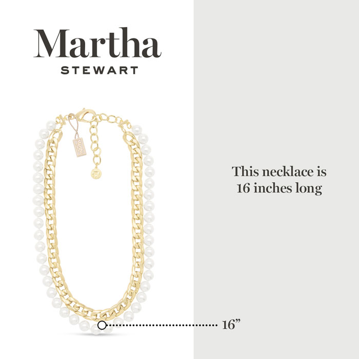 Exuding class, style, and timeless elegance, the Martha Stewart fashion jewelry collection is a true celebration of sophistication. This exquisite collection highlights distinctive chains, iridescent glass pearls, and dazzling crystals, all crafted with yellow gold-plated metal. Each piece reflects Martha Stewart's signature flair, offering a blend of uniqueness and refined style. This Martha Stewart necklace features one iridescent glass pearl strands and one curb chain with each iridescent glass pearl measuring 10mm. The chain length is 16 inches. This necklace is in yellow gold-plated brass metal and has a lobster claw clasp with a three inch extender.