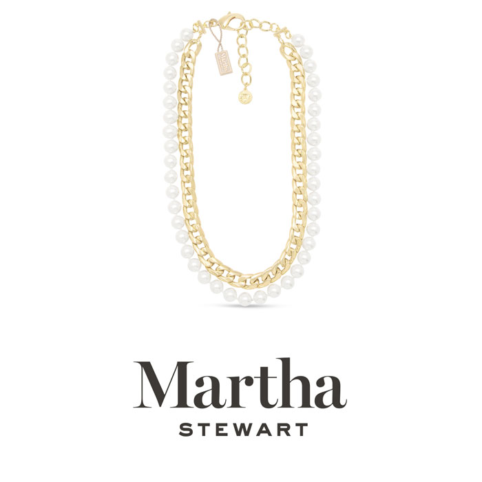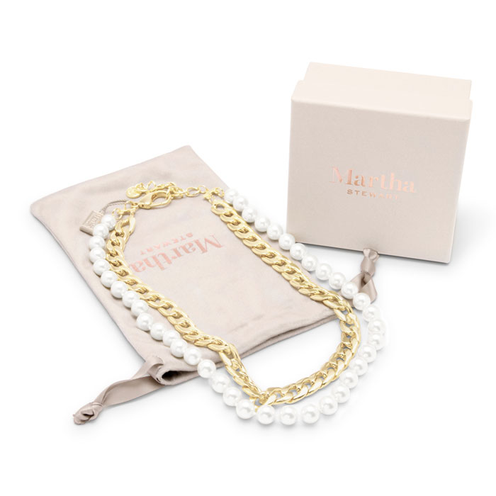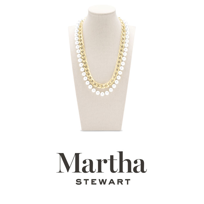 Exuding class, style, and timeless elegance, the Martha Stewart fashion jewelry collection is a true celebration of sophistication. This exquisite collection highlights distinctive chains, iridescent glass pearls, and dazzling crystals, all crafted with yellow gold-plated metal. Each piece reflects Martha Stewart's signature flair, offering a blend of uniqueness and refined style. This Martha Stewart necklace features one iridescent glass pearl strands and one curb chain with each iridescent glass pearl measuring 10mm. The chain length is 16 inches. This necklace is in yellow gold-plated brass metal and has a lobster claw clasp with a three inch extender.