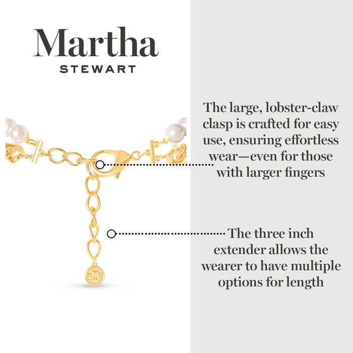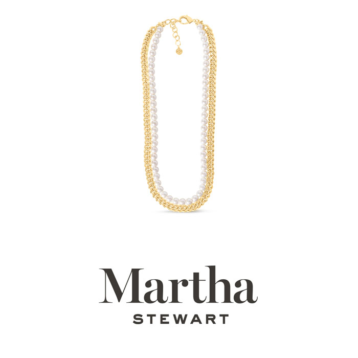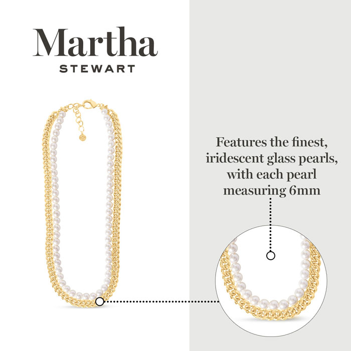 Exuding class, style, and timeless elegance, the Martha Stewart fashion jewelry collection is a true celebration of sophistication. This exquisite collection highlights distinctive chains, iridescent glass pearls, and dazzling crystals, all crafted with yellow gold-plated metal. Each piece reflects Martha Stewart's signature flair, offering a blend of uniqueness and refined style. This Martha Stewart necklace features one iridescent glass pearl strand and one curb chain with each iridescent glass pearl measuring 10mm. The chain length is 24 inches. This necklace is in yellow gold-plated brass metal and has a lobster claw clasp with a three inch extender.