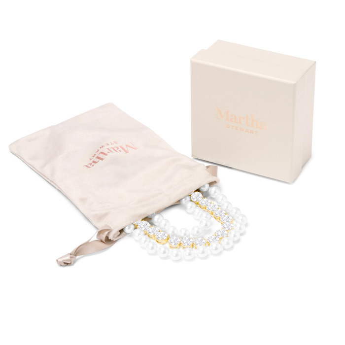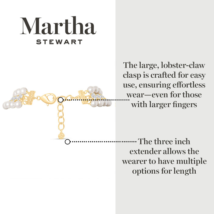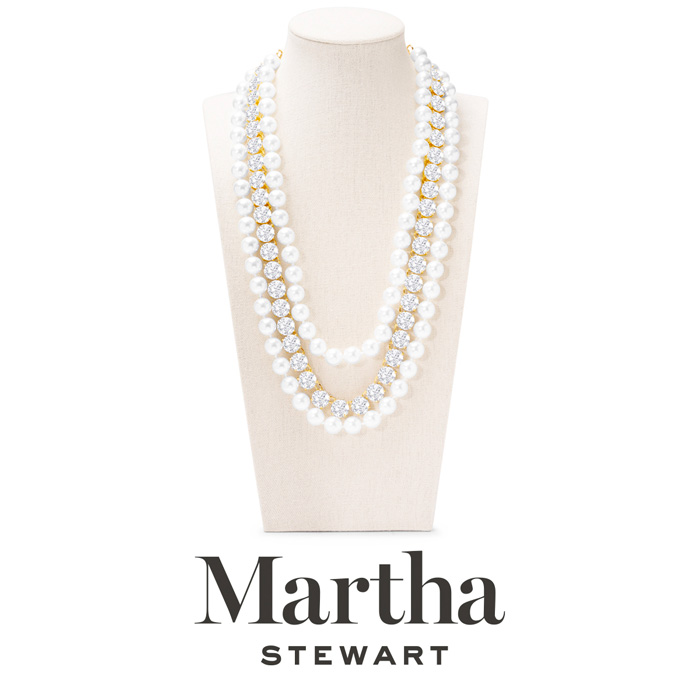 Exuding class, style, and timeless elegance, the Martha Stewart fashion jewelry collection is a true celebration of sophistication. This exquisite collection highlights distinctive chains, iridescent glass pearls, and dazzling crystals, all crafted with yellow gold-plated metal. Each piece reflects Martha Stewart's signature flair, offering a blend of uniqueness and refined style. This Martha Stewart necklace features two iridescent glass pearl strands and one crystal strand with each iridescent glass pearl measuring 9mm. The chain length is 18 inches. This necklace is in yellow gold-plated brass metal and has a lobster claw clasp with a three inch extender.