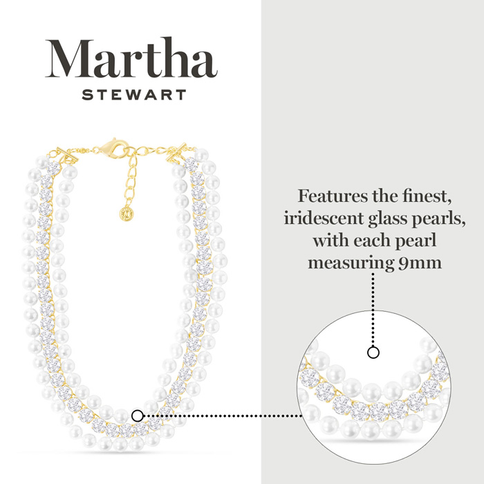 Exuding class, style, and timeless elegance, the Martha Stewart fashion jewelry collection is a true celebration of sophistication. This exquisite collection highlights distinctive chains, iridescent glass pearls, and dazzling crystals, all crafted with yellow gold-plated metal. Each piece reflects Martha Stewart's signature flair, offering a blend of uniqueness and refined style. This Martha Stewart necklace features two iridescent glass pearl strands and one crystal strand with each iridescent glass pearl measuring 9mm. The chain length is 18 inches. This necklace is in yellow gold-plated brass metal and has a lobster claw clasp with a three inch extender.