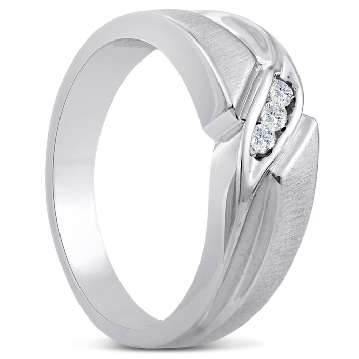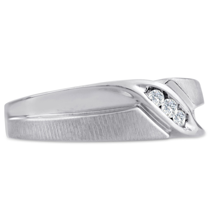 Men's diamond ring, great for a wedding band and everyday wear. This ring features 3 diamonds at 0.08ct total diamond weight. Diamond color is J-K and diamond clarity is I2. Ring is 6.73mm wide. This ring is crafted in solid 10 karat white gold and is available in ring sizes 7-13.5