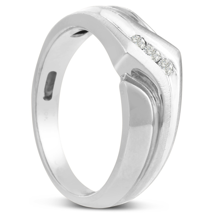 Men's diamond ring, great for a wedding band and everyday wear. This ring features 3 diamonds at 0.09ct total diamond weight. Diamond color is J-K and diamond clarity is I2. Ring is 7.53mm wide. This ring is crafted in solid 10 karat white gold and is available in ring sizes 7-13.5