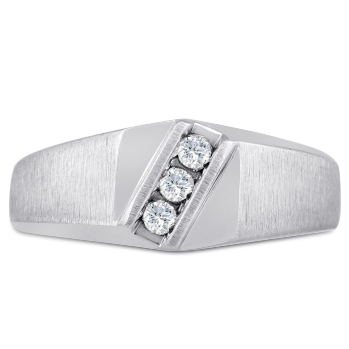 Men's diamond ring, great for a wedding band and everyday wear. This ring features 3 diamonds at 0.12ct total diamond weight. Diamond color is I-J and diamond clarity is I1-I2. Ring is 9.10mm wide. This ring is crafted in solid 14 karat white gold and is available in ring sizes 7-13.5
