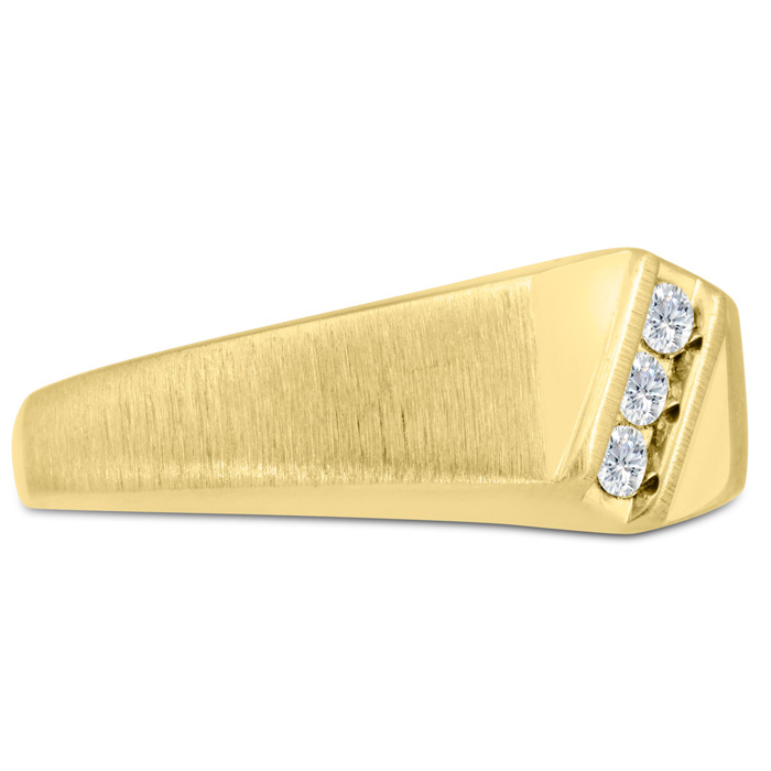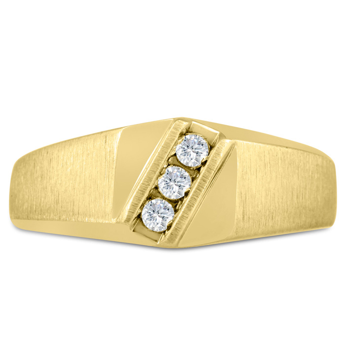 Men's diamond ring, great for a wedding band and everyday wear. This ring features 3 diamonds at 0.12ct total diamond weight. Diamond color is I-J and diamond clarity is I1-I2. Ring is 9.10mm wide. This ring is crafted in solid 14 karat yellow gold and is available in ring sizes 7-13.5