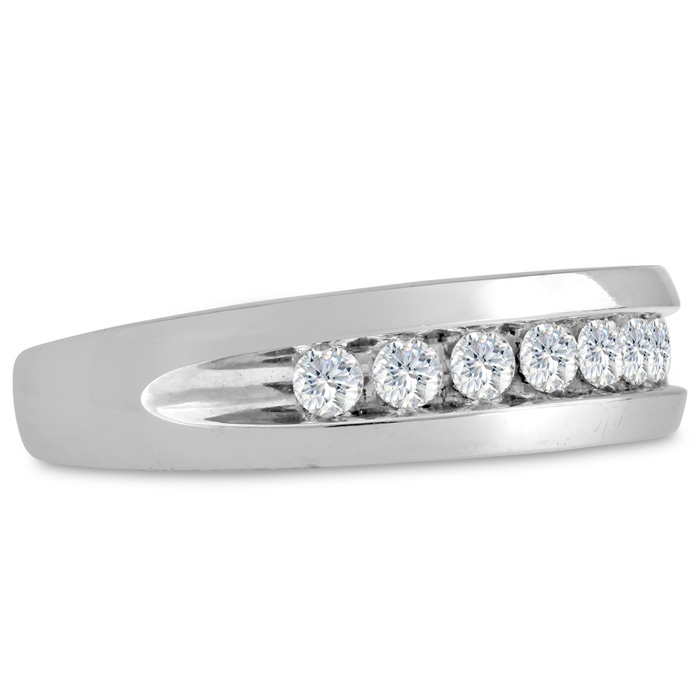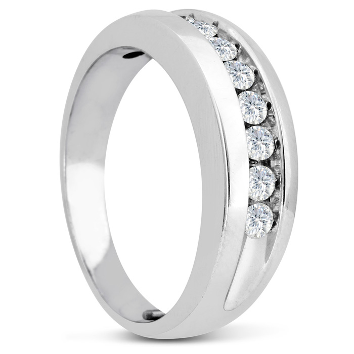 Men's diamond ring, great for a wedding band and everyday wear. This ring features 8 diamonds at 0.50ct total diamond weight. Diamond color is I-J and diamond clarity is I1-I2. Ring is 6.57mm wide. This ring is crafted in solid 14 karat white gold and is available in ring sizes 7-13.5