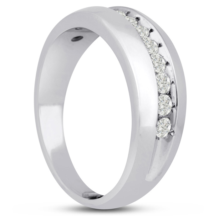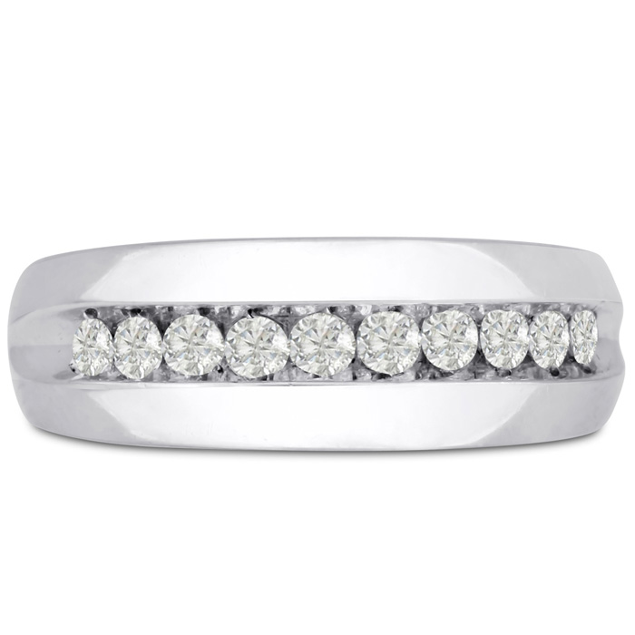 Men's diamond ring, great for a wedding band and everyday wear. This ring features 10 diamonds at 0.50ct total diamond weight. Diamond color is I-J and diamond clarity is I1-I2. Ring is 7.80mm wide. This ring is crafted in solid 14 karat white gold and is available in ring sizes 7-13.5