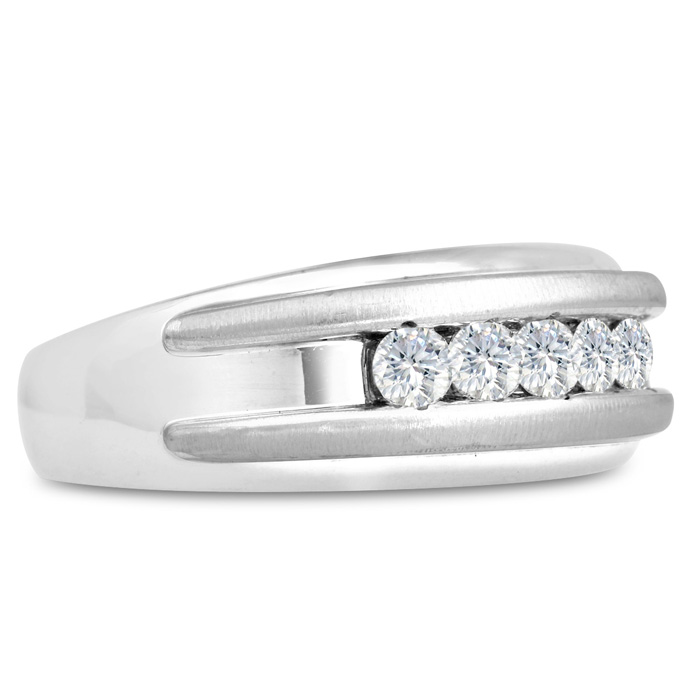 Men's diamond ring, great for a wedding band and everyday wear. This ring features 5 diamonds at 0.50ct total diamond weight. Diamond color is I-J and diamond clarity is I1-I2. Ring is 9.0mm wide. This ring is crafted in solid 14 karat white gold and is available in ring sizes 7-13.5