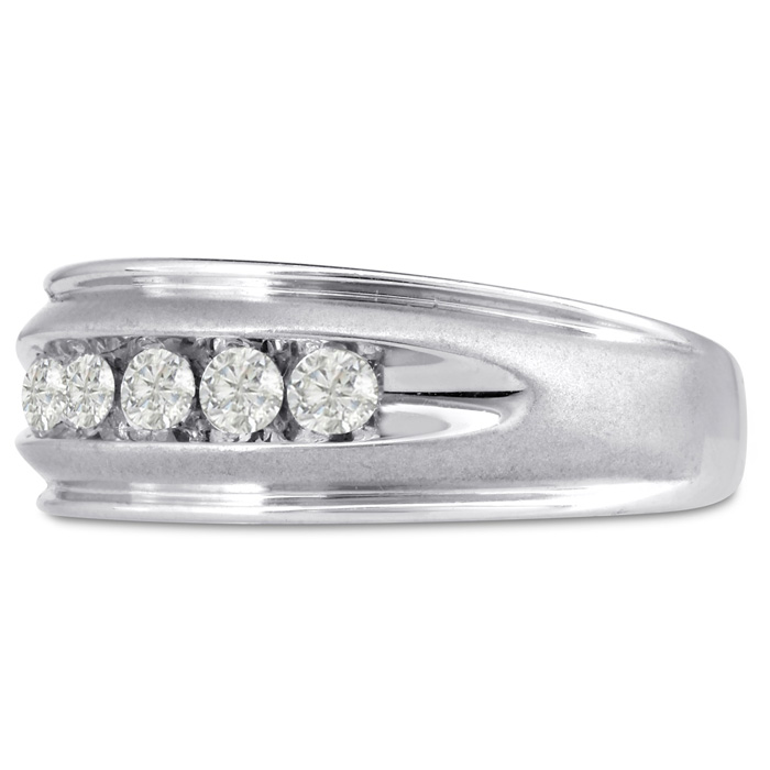 Men's diamond ring, great for a wedding band and everyday wear. This ring features 5 diamonds at 0.50ct total diamond weight. Diamond color is I-J and diamond clarity is I1-I2. Ring is 8.68mm wide. This ring is crafted in solid 14 karat white gold and is available in ring sizes 7-13.5