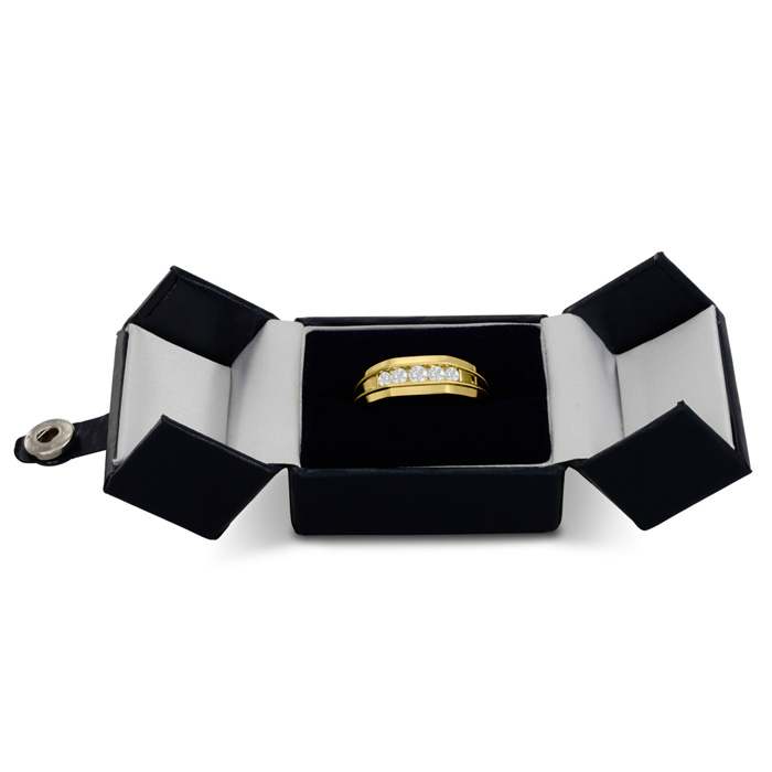 Men's diamond ring, great for a wedding band and everyday wear. This ring features 5 diamonds at 0.50ct total diamond weight. Diamond color is I-J and diamond clarity is I1-I2. Ring is 7.34mm wide. This ring is crafted in solid 14 karat yellow gold and is available in ring sizes 7-13.5