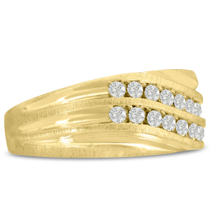 Men's diamond ring, great for a wedding band and everyday wear. This ring features 14 diamonds at 0.49ct total diamond weight. Diamond color is I-J and diamond clarity is I1-I2. Ring is 10.13mm wide. This ring is crafted in solid 14 karat yellow gold and is available in ring sizes 7-13.5