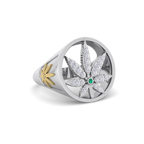 This emerald and diamond ring features a cannabis leaf design on the top and two on the side. It is adorned with 22 diamonds in H-I color, I1-I2 clarity and one emerald gemstone. Total carat weight is 1/3 carat. This ring is 19mm wide and is in 14 karat white gold.