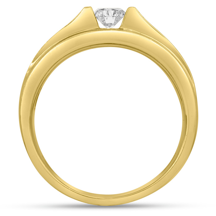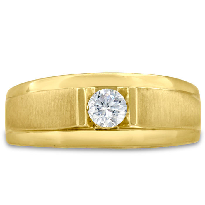 Men's diamond ring, great for a wedding band and everyday wear. This ring features 1 diamond at 0.33ct total diamond weight. Diamond color is I-J and diamond clarity is I1-I2. Ring is 8.78mm wide. This ring is crafted in solid 14 karat yellow gold and is available in ring sizes 7-13.5