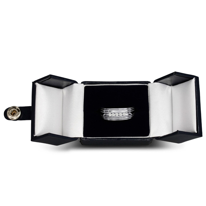 Men's diamond ring, great for a wedding band and everyday wear. This ring features 5 diamonds at 0.25ct total diamond weight. Diamond color is J-K and diamond clarity is I2. Ring is 8.36mm wide. This ring is crafted in solid 10 karat white gold and is available in ring sizes 7-13.5