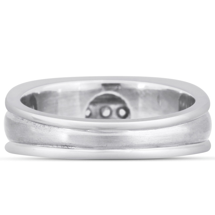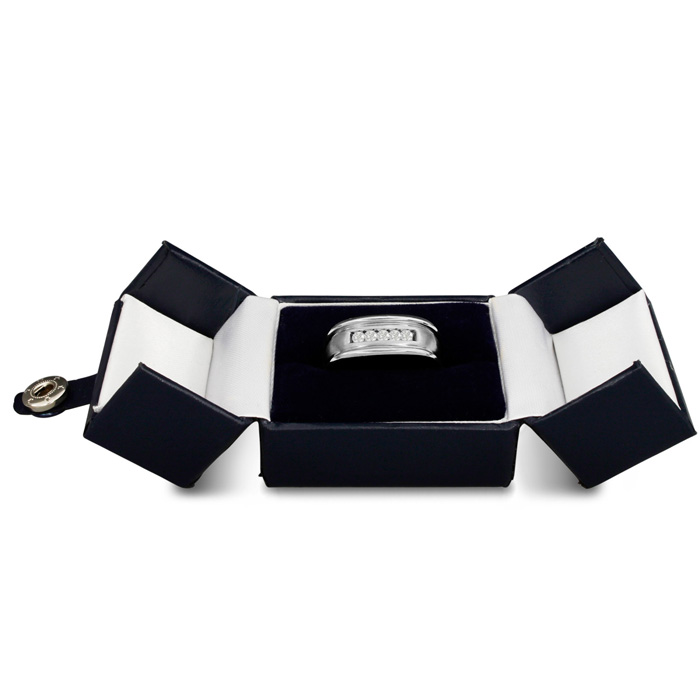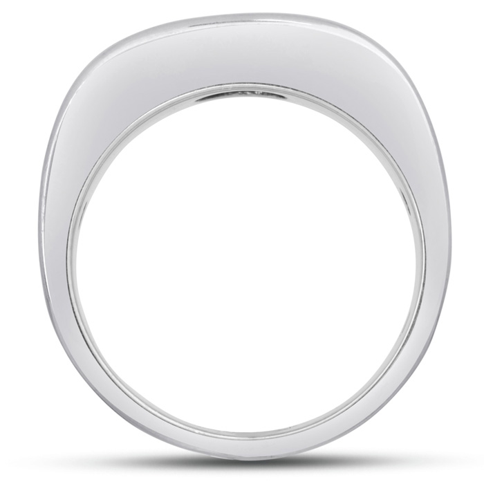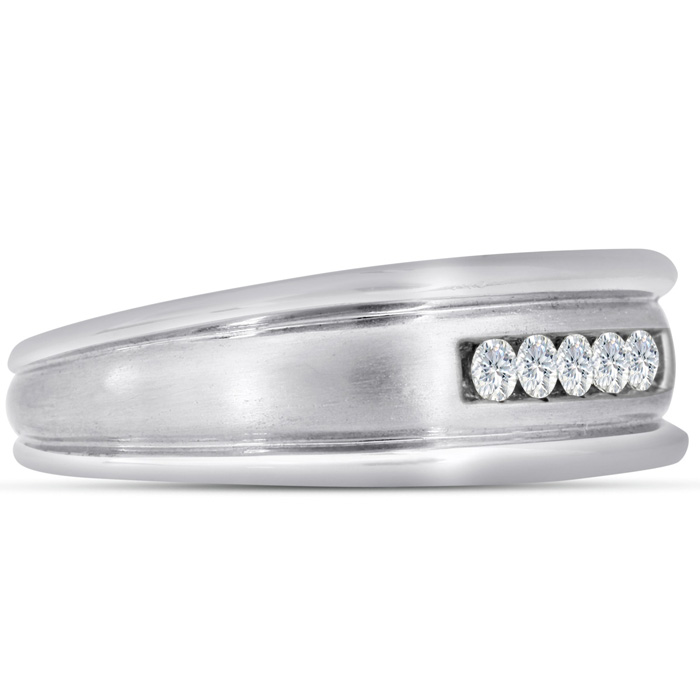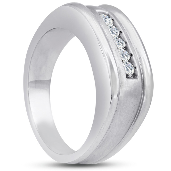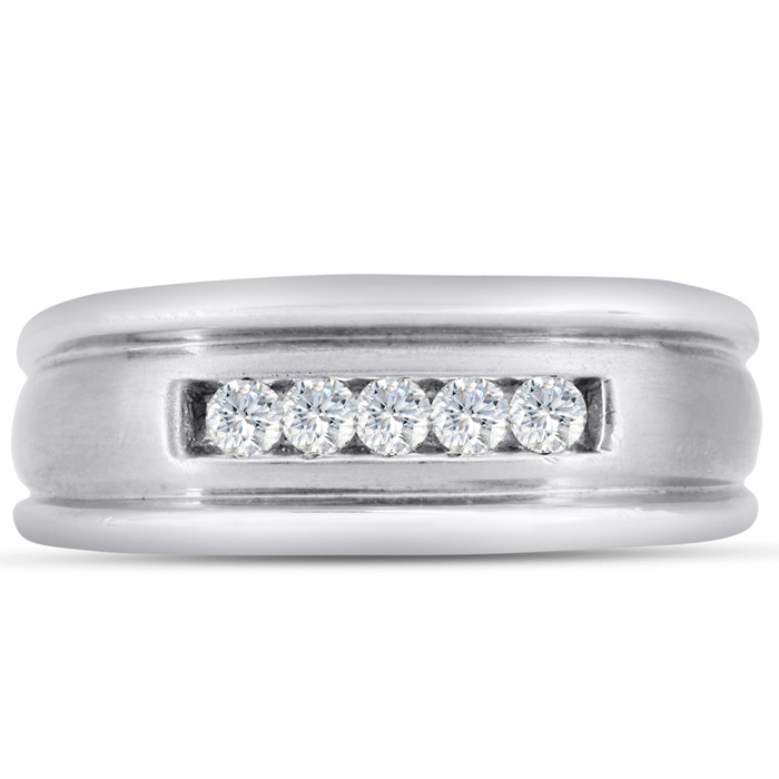 Men's diamond ring, great for a wedding band and everyday wear. This ring features 5 diamonds at 0.25ct total diamond weight. Diamond color is I-J and diamond clarity is I1-I2. Ring is 8.61mm wide. This ring is crafted in solid 14 karat white gold and is available in ring sizes 7-13.5