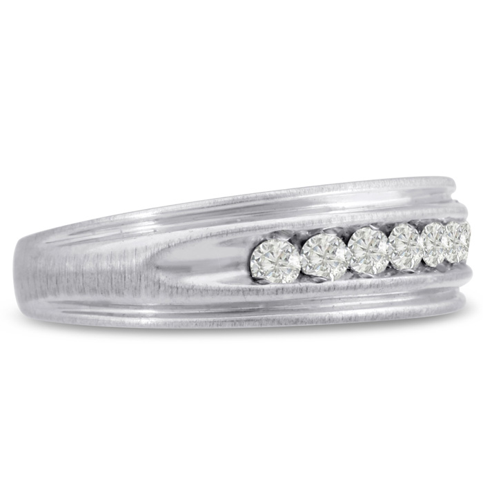 Men's diamond ring, great for a wedding band and everyday wear. This ring features 7 diamonds at 0.25ct total diamond weight. Diamond color is I-J and diamond clarity is I1-I2. Ring is 6.47mm wide. This ring is crafted in solid 14 karat white gold and is available in ring sizes 7-13.5