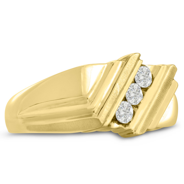 Men's diamond ring, great for a wedding band and everyday wear. This ring features 3 diamonds at 0.24ct total diamond weight. Diamond color is I-J and diamond clarity is I1-I2. Ring is 10.19mm wide. This ring is crafted in solid 14 karat yellow gold and is available in ring sizes 7-13.5