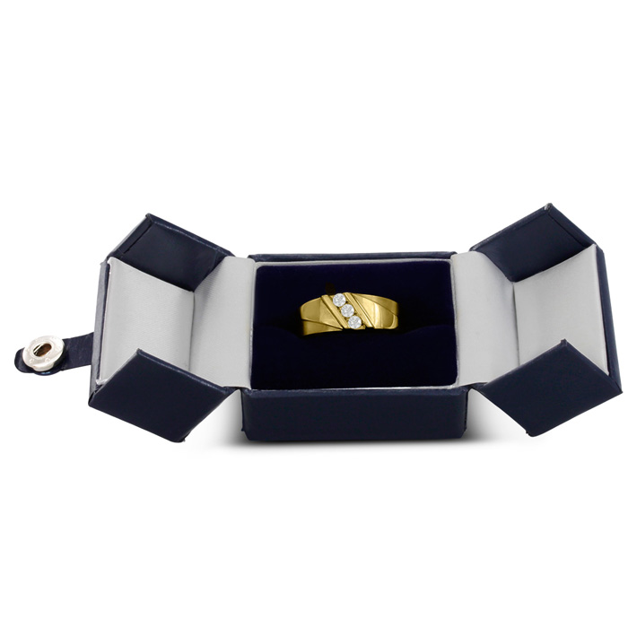Men's diamond ring, great for a wedding band and everyday wear. This ring features 3 diamonds at 0.24ct total diamond weight. Diamond color is I-J and diamond clarity is I1-I2. Ring is 8.24mm wide. This ring is crafted in solid 14 karat yellow gold and is available in ring sizes 7-13.5
