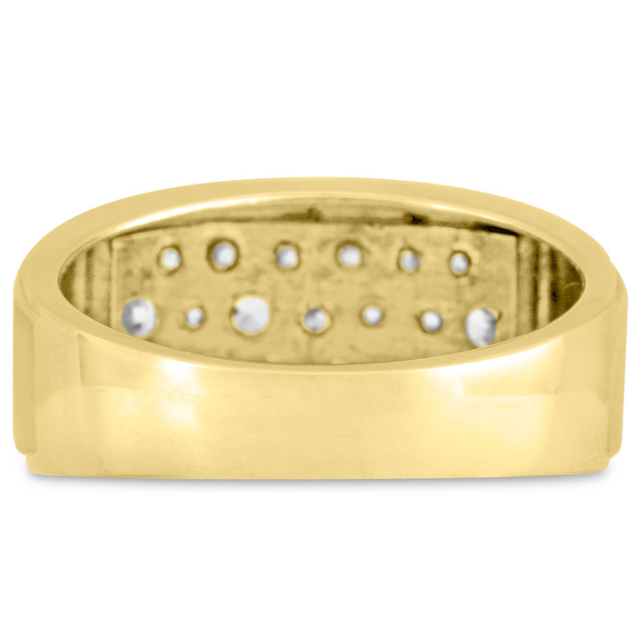 Men's diamond ring, great for a wedding band and everyday wear. This ring features 19 diamonds at 0.95ct total diamond weight. Diamond color is J-K and diamond clarity is I2. Ring is 11.73mm wide. This ring is crafted in solid 10 karat yellow gold and is available in ring sizes 7-13.5