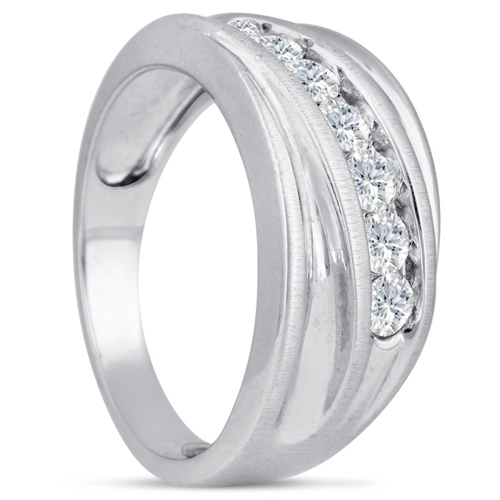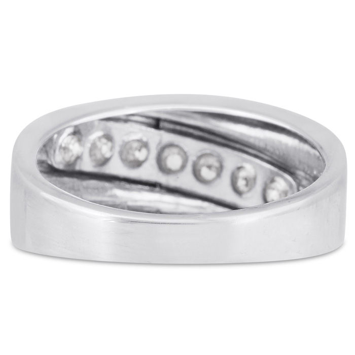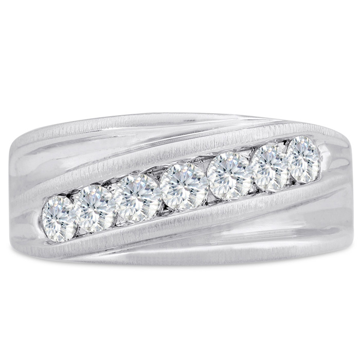 Men's diamond ring, great for a wedding band and everyday wear. This ring features 7 diamonds at 0.98ct total diamond weight. Diamond color is I-J and diamond clarity is I1-I2. Ring is 10.21mm wide. This ring is crafted in solid 14 karat white gold and is available in ring sizes 7-13.5