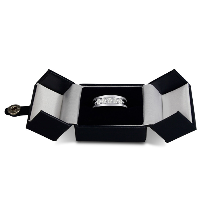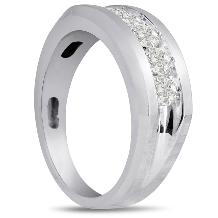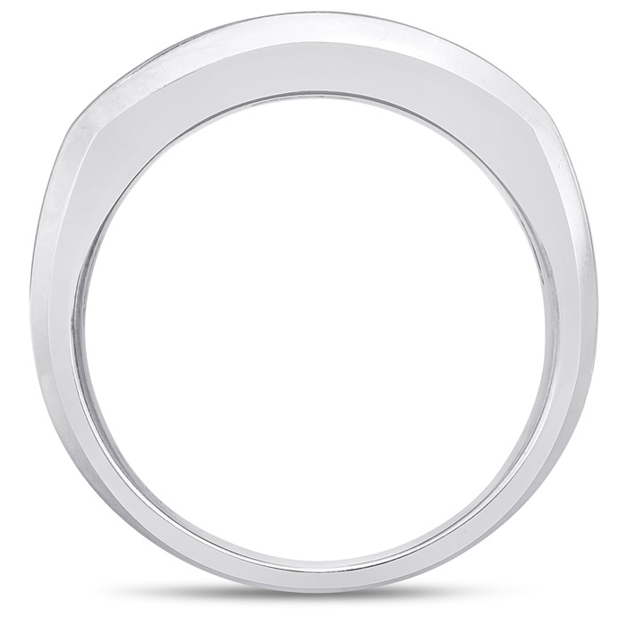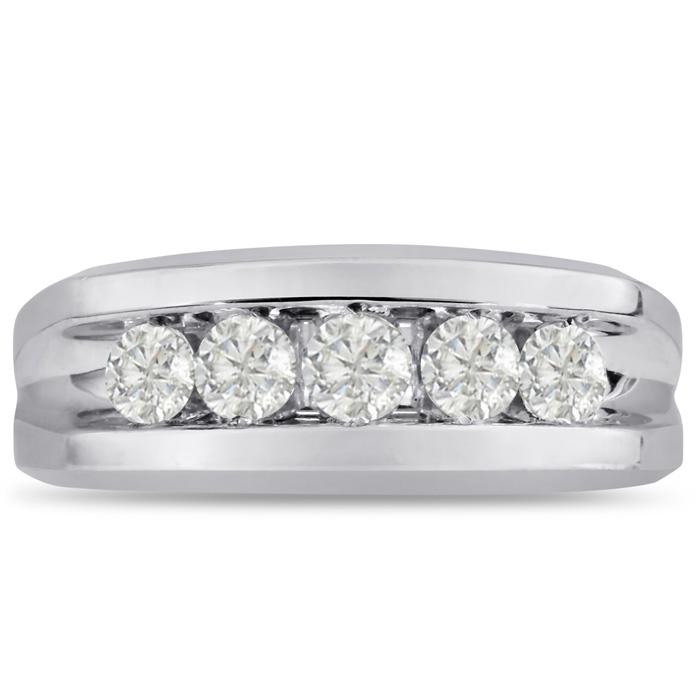 Men's diamond ring, great for a wedding band and everyday wear. This ring features 5 diamonds at 0.99ct total diamond weight. Diamond color is I-J and diamond clarity is I1-I2. Ring is 8.85mm wide. This ring is crafted in solid 14 karat white gold and is available in ring sizes 7-13.5