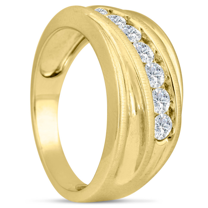 Men's diamond ring, great for a wedding band and everyday wear. This ring features 7 diamonds at 0.98ct total diamond weight. Diamond color is I-J and diamond clarity is I1-I2. Ring is 10.21mm wide. This ring is crafted in solid 14 karat yellow gold and is available in ring sizes 7-13.5