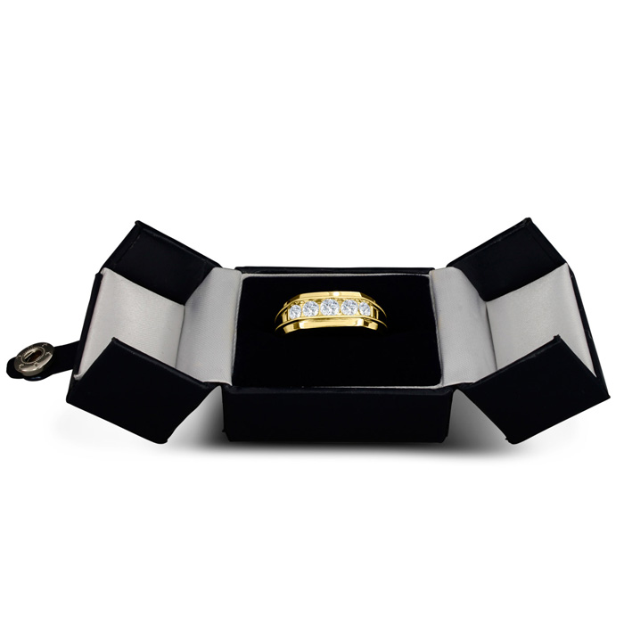 Men's diamond ring, great for a wedding band and everyday wear. This ring features 5 diamonds at 1.00ct total diamond weight. Diamond color is I-J and diamond clarity is I1-I2. Ring is 8.33mm wide. This ring is crafted in solid 14 karat yellow gold and is available in ring sizes 7-13.5
