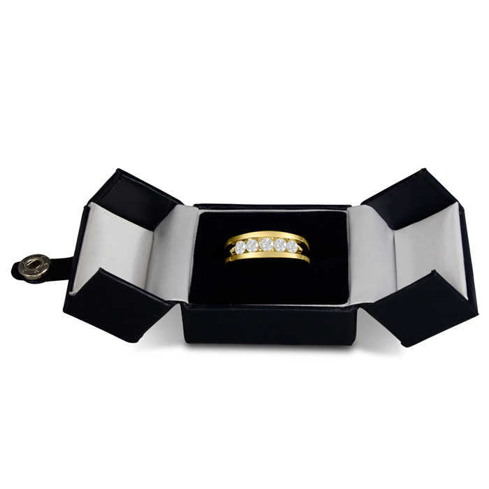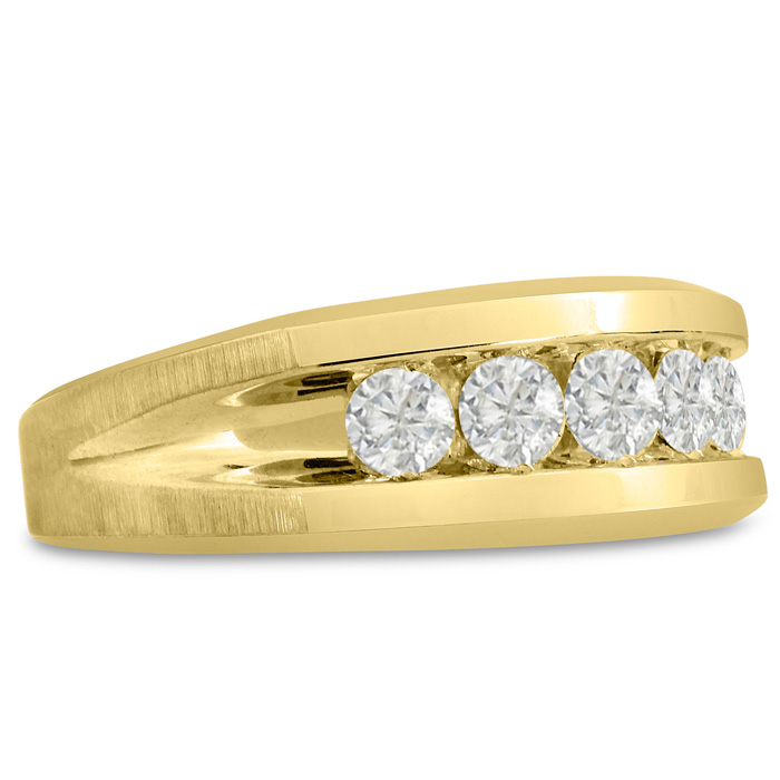 Men's diamond ring, great for a wedding band and everyday wear. This ring features 5 diamonds at 0.99ct total diamond weight. Diamond color is I-J and diamond clarity is I1-I2. Ring is 8.85mm wide. This ring is crafted in solid 14 karat yellow gold and is available in ring sizes 7-13.5