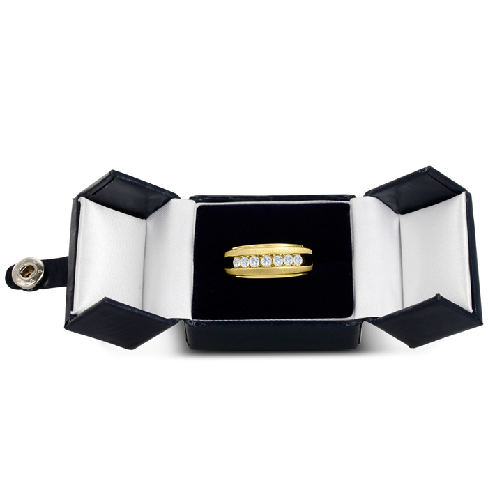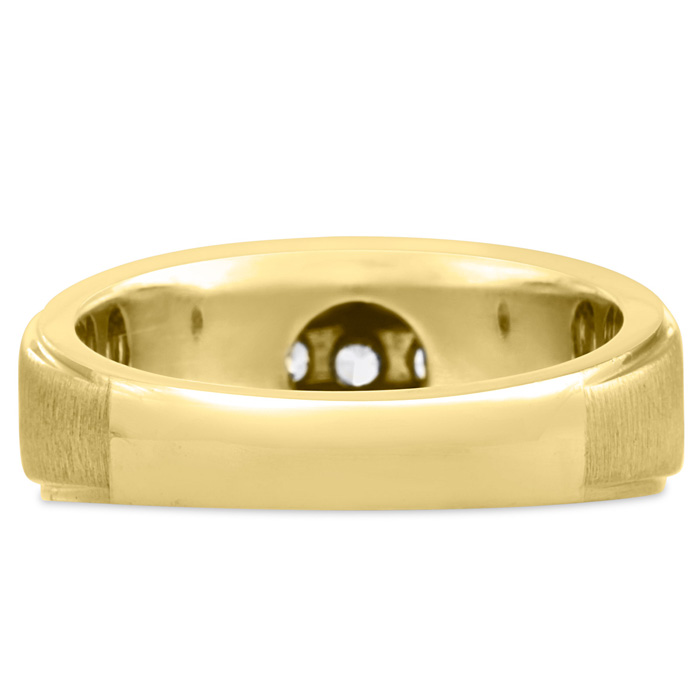 Men's diamond ring, great for a wedding band and everyday wear. This ring features 7 diamonds at 0.77ct total diamond weight. Diamond color is I-J and diamond clarity is I1-I2. Ring is 9.44mm wide. This ring is crafted in solid 14 karat yellow gold and is available in ring sizes 7-13.5