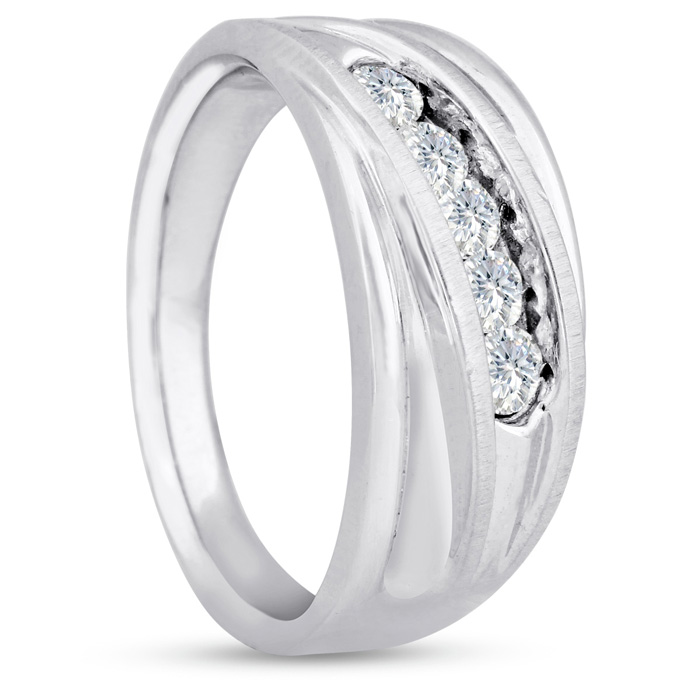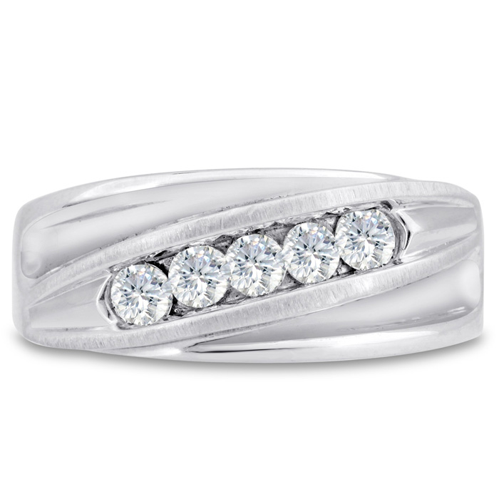 Men's diamond ring, great for a wedding band and everyday wear. This ring features 5 diamonds at 0.60ct total diamond weight. Diamond color is I-J and diamond clarity is I1-I2. Ring is 9.50mm wide. This ring is crafted in solid 14 karat white gold and is available in ring sizes 7-13.5