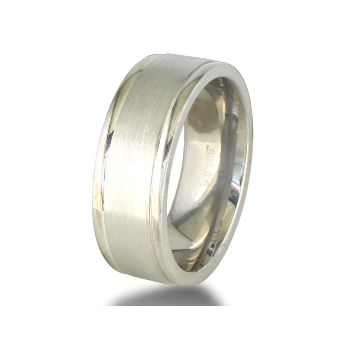 Very high quality mens and womens unisex sterling silver wedding band ring, featuring a finely brush finished center between high polished bands. The band is 8mm wide. This mens or womens weddingring band is available in ring size 4, 4.5, 5, 5.5, 6, 6.5, 7, 7.5, 8, 8.5, 9, 9.5, 10, 10.5, 11, 11.5, 12, 12.5, 13, 13.5 and 14.