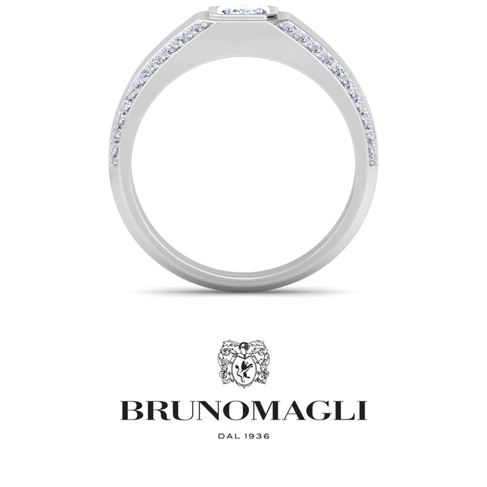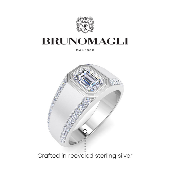 Bruno Magli men's jewelry blends refined Italian craftsmanship with contemporary style, creating timeless accessories for the modern man. Each piece is expertly designed using high-quality materials, adding a touch of sophistication to any outfit. This Bruno Magli mens lab grown diamond ring features a 1 carat emerald cut center lab grown diamond in G-H color, VS clarity. It is accented with 44 round lab grown diamonds. Total carat weight is 1 1/2 carats. This ring is in sterling silver. Bruno Magli jewelry utilizes sustainable luxury by using recycled precious metals, eco-friendly lab-grown diamonds, and iconic branding for a refined touch.