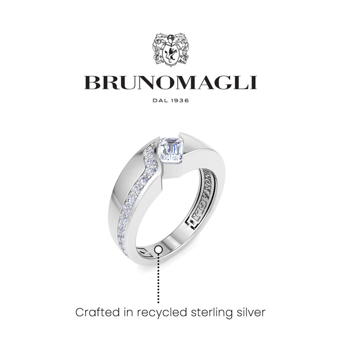 Bruno Magli men's jewelry blends refined Italian craftsmanship with contemporary style, creating timeless accessories for the modern man. Each piece is expertly designed using high-quality materials, adding a touch of sophistication to any outfit. This Bruno Magli mens lab grown diamond ring features a 3/4 carat emerald cut center lab grown diamond in G-H color, VS clarity. There are 14 round lab grown diamond accents. Total carat weight is 1 carat. This ring is in sterling silver. Bruno Magli jewelry utilizes sustainable luxury by using recycled precious metals, eco-friendly lab-grown diamonds, and iconic branding for a refined touch.