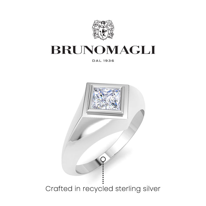 Bruno Magli men's jewelry blends refined Italian craftsmanship with contemporary style, creating timeless accessories for the modern man. Each piece is expertly designed using high-quality materials, adding a touch of sophistication to any outfit. This Bruno Magli mens lab grown diamond ring features a 1 carat princess cut center lab grown diamond in G-H color, VS clarity. This ring is in sterling silver. Bruno Magli jewelry utilizes sustainable luxury by using recycled precious metals, eco-friendly lab-grown diamonds, and iconic branding for a refined touch.