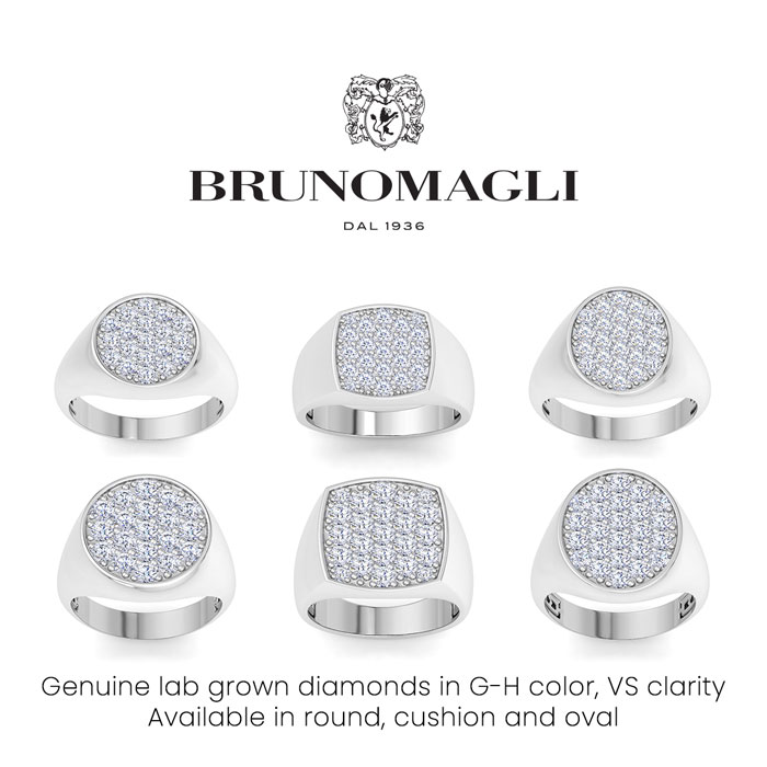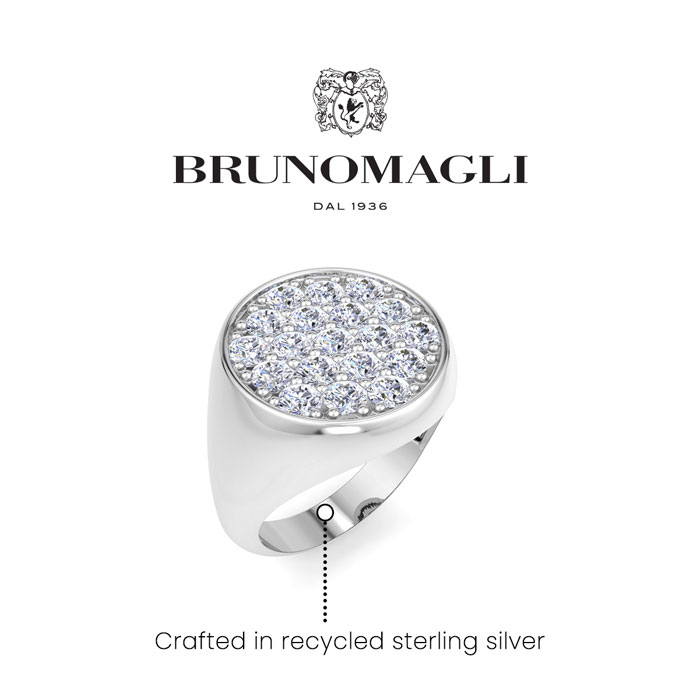 Bruno Magli men's jewelry blends refined Italian craftsmanship with contemporary style, creating timeless accessories for the modern man. Each piece is expertly designed using high-quality materials, adding a touch of sophistication to any outfit. This Bruno Magli mens lab grown diamond ring features 19 round shape lab grown diamonds in G-H color, VS clarity totaling 2 carats. This ring is in sterling silver. Bruno Magli jewelry utilizes sustainable luxury by using recycled precious metals, eco-friendly lab-grown diamonds, and iconic branding for a refined touch.