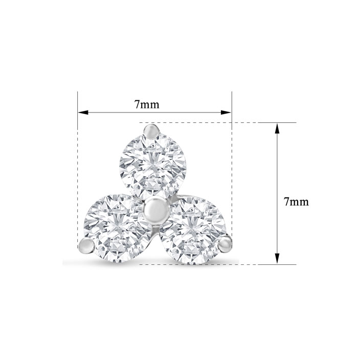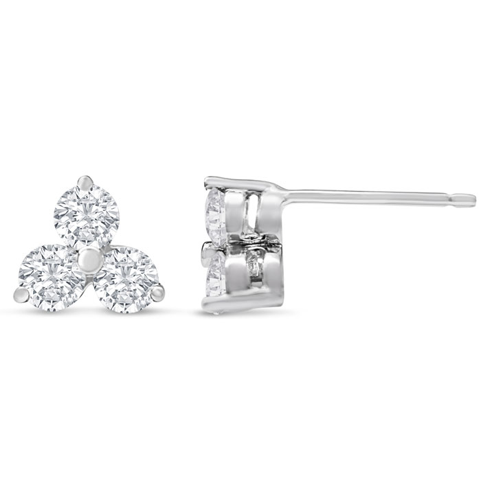 These moissanite earrings feature six 2.75mm moissanite gemstones each weighing 0.8 carats. Total carat weight is 1/2 carat. Moissanite color is E-F, moissanite clarity is VVS1-VVS2. These earrings are in sterling silver and have post with friction backs.