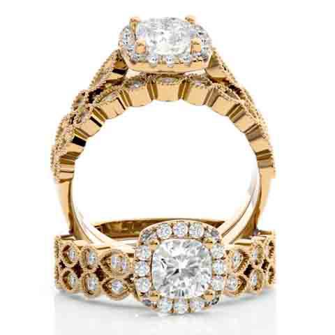 1 1/2 Carat Cushion Cut Moissanite Bridal Set In 14 Karat Yellow Gold