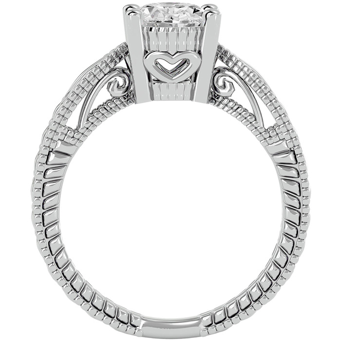 This fabulous solitaire engagement ring with tapered etched band features a sparkling 1 1/2 carat oval shape center moissanite in E-F color, VVS1-VVS2 clarity. This ring is in 14 karat white gold.